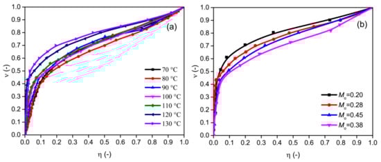 The results of normalization are plotted in Figure 9. As Figure 9 shows, the drying temperature and initial moisture content had an obvious influence on the normalized single particle drying curves. Figure 9a presents the normalized single particle drying curves for various drying temperatures. From Figure 9a, the evolutions of the normalized single-particle drying curves could be divided into two periods, namely, the dramatically rising period (η = 0~0.15) and the slowly rising period (η = 0.15~1.00). When the normalized biomass moisture content reached 0.1, the influence on the normalized drying rate was the most noticeable. As the drying temperature increased, the value of ν generally increased. Specifically, the critical moisture was lower, and the value of ν was greater, as shown in Figure 5b. These results proved that there were remarkable negative relevant relations between the critical moisture and the normalized biomass moisture content. Figure 9b illustrates the results of normalization for various Mo. From Figure 9b, the evolutions of normalized single particle drying curves also had two periods (the dramatically rising period and the slowly rising period). Compared to Figure 9a, the dramatically rising period (η = 0~0.05) became shorter. The results indicated that the initial moisture content had a marginal effect on the value of ν during the slowly rising period. The value of ν decreased with the increase in Mo. As shown in Figure 9b, the critical moisture decreased with the increase in Mo. This result further proved that the critical moisture and the normalized biomass moisture content obviously had a negative relevant relationship. Similar results have been reported by other authors [15,17].