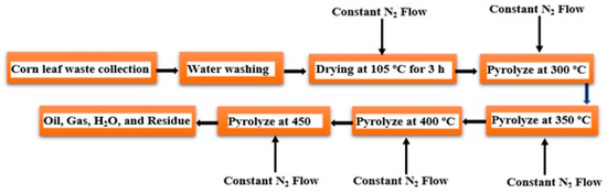 | Corn leaf waste | Jordan [63] | Biofuel | Pyrolysis (300–450 °C). | - | 450 °C was found to yield more oil from corn leaf waste. |
