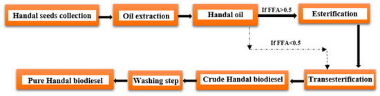 | Citrullus Colocynths (Handal) seeds oil | Jordan [165] | Biodiesel | Esterification: The catalyst is sulfuric acid (H2SO4), and the reactant is methanol (CH3OH). The FFA content after esterification must be less than 0.5% for biodiesel production. Transesterification: The optimal method for the transesterification of Handal oil requires the addition of methanol equivalent to 0.217 × (unreacted triglycerides in grams) as well as sodium methoxide equal to [0.25 + 0.19 × (%FFA)]/[100 × unreacted triglycerides in grams]. The crude biodiesel obtained is then washed and purified with hot water. | - |
