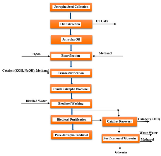 | Jatropha seeds oil | India [188] | Biodiesel | In the transesterification reactor, Jatropha seeds oil is combined with alcohol (Methanol) and a catalyst mixture (KOH, NaOH). The reactor is maintained at reaction temperature for a set period of time while being vigorously agitated. Following the reaction, the biodiesel and glycerol mixture is transferred to the glycerol sedimentation tanks. Crude Jatropha biodiesel is gathered and washed with water to obtain pure biodiesel. | - |