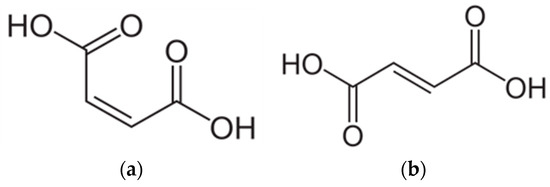 A different configuration (cis/trans) within the double bond causes differences in the physicochemical properties of FA and MA that have been defined experimentally [7,13,20,21,22,23,24,25]. Table 1 presents basic experimental [7,13,20,21,22,23,24,25] and theoretical [26,27] physicochemical properties of fumaric and maleic acids.