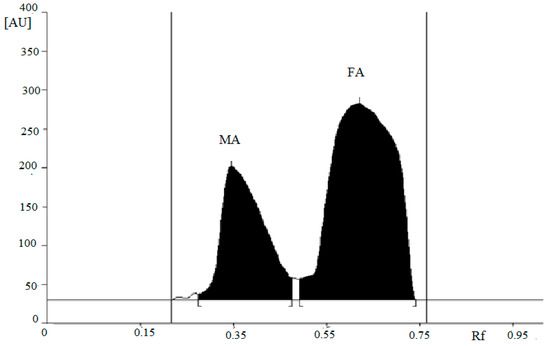 Densitogram of the mixture of fumaric acid (FA) and maleic acid (MA) after extraction in the n-octanol–water system and separation by NP-TLC.
