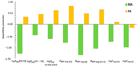 The lipophilicity of FA and MA obtained in this work by different methods within the literature data were compared (Figure 3).