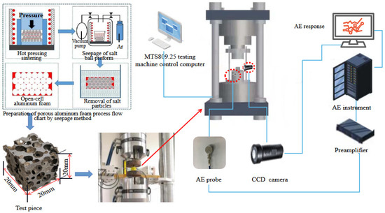 Acoustic emission (AE) is a dynamic non-destructive testing technique with high sensitivity and wide applicability, which can reveal the deformation and damage state of a specimen by collecting the elastic waves generated by the release of strain energy during the deformation and damage process [29]. It is commonly employed in the inspection of metallic materials and rocks. Numerous scholars [30,31,32,33,34,35,36,37] have monitored and characterized the damage behavior of gears, steel structures, foam metals with different matrix materials and preparation methods, and composite metal materials. The damage evolution characteristics are sensitively captured by predicting and measuring the compressive behavior and deformation mechanism, fatigue crack propagation, and residual life of parts through the variation characteristics of acoustic emission signals. The technique is also extensively utilized in the study of damage caused by deformation mechanisms in rocks [38,39,40,41]. While aluminum foam has similar pore characteristics to rocks and has the properties of metallic materials at the same time, little research has been carried out on open-cell aluminum foam, and completed studies on the compression and fatigue properties of open-cell aluminum foam using AE techniques are considerably sparse in China and abroad [42,43].