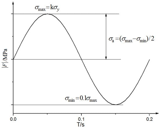 The experimental materials were open-cell aluminum foam provided by a manufacturer. The composition of ZL102 alloy is shown in Table 1, and the manufacturing process of the specimen is shown in Figure 1. The pore size was 3–5 mm, the density was 1.2 ± 10% g/cm3, the relative density was 0.44, and the specimen size was 20 mm × 20 mm × 20 mm. To ensure that the basic parameters of the material were consistent, all specimens were cut from the same aluminum foam plate material. Quasi-static compression test and fatigue test were conducted on the MTS809.25 testing machine. The quasi-static compression rates were 2 mm/min, 10 mm/min, and 50 mm/min, and the fatigue test was loaded with a sine wave load with a frequency of 10 Hz (Figure 2). A constant fatigue load cycle ratio of R = 0.1 (R = /) was adopted, and the peak stress ratio was defined as , where (6 MPa) is the yield stress and k was chosen as 1.0, 1.1, 1.2, and 1.3,. Each group of experiments was repeated three times, a total of 9 specimens were subjected to quasi-static compression test, and fatigue tests were conducted on a total of 12 specimens.