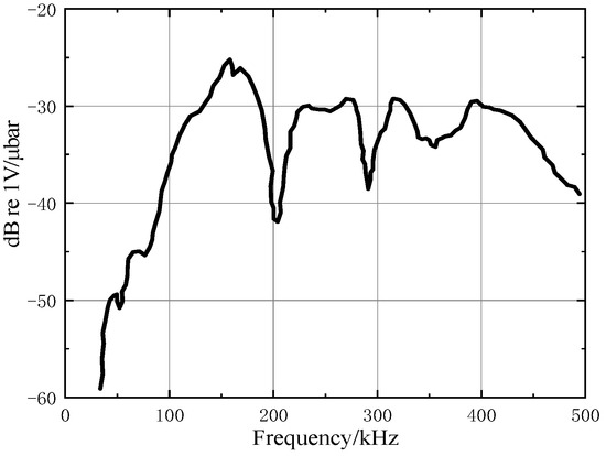The AE instrument was the AMSY-6 type of Vallen, Germany. The sensor probe model was VS150-RIC. The specific parameters are shown in Table 2, and the resonant frequency response curve is shown in Figure 3, the threshold value was set to 40 dB, and the sampling rate was 1 MHz. The load and displacement data of the test machine were recorded simultaneously by using the external channel of the AE instrument. The metal material with the Kaiser effect was utilized in the base, and multiple loading and unloading cycles were carried out before the test to reduce the AE signal interference generated by the base during the experiment. The AE sensor was fixed on the base, and the sensor position is shown in Figure 1. The Vaseline coupling agent was applied on the surface of the specimen as a medium for transmitting acoustic signals. In this way, the elastic wave could effectively penetrate the measured object and effective detection could be achieved.