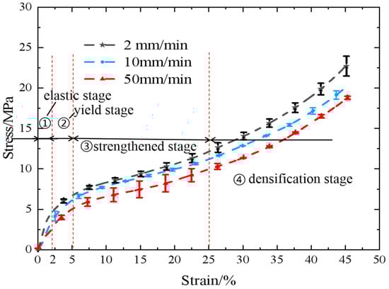 The engineering stress–strain curve of open-cell aluminum foam obtained by quasi-static compression test is displayed in Figure 4. The results suggested that the engineering stress–strain curves obtained at different compression rates were the same, showing four stages of the elastic stage, the yield stage, the strengthened stage, and the densification stage [2,44]. There was no obvious distinction between the yield stage and the densification stage, and there was no evident yield point between the elastic stage and the yield stage [45]. The stress growth rate and stress value in the elastic deformation stage at the low compression rate were greater than those at the high compression rate. In the yield stage, the stress increased slowly with the strain, and the differences in the stress values at different compression rates were small. This indicated that the strain rate had little influence on the plastic deformation stage.