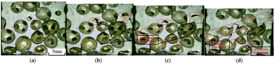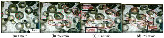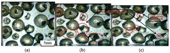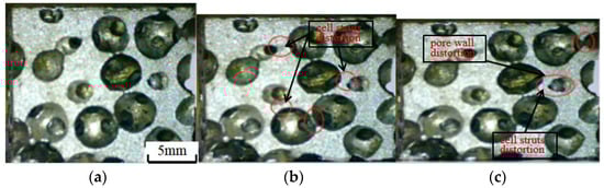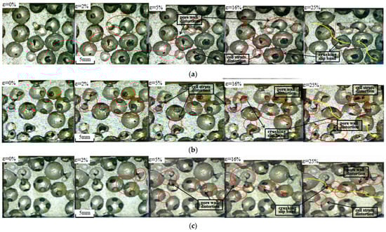 The results manifested that the specimen was substantially deformed due to the compression of the pore wall and bars when the strain reached about 5%, and the strain cumulated with the increase in the number of cycles, and when the strain reached 10%, the specimen began to become dense. At k = 1.0, the shear deformation of the pore wall and fascia was small. At k = 1.1, the shear deformation of the pore walls and bars was uniform and no obvious collapse zone or deformation zone appeared. At k = 1.2, some of the cell pores were closed due to compression (Figure 15c). At k = 1.3, the specimen already exhibited obvious collapse deformation zones at 5% strain due to a larger load, the collapse of the pore walls, and severe shear deformation of the pore edges (Figure 16b).