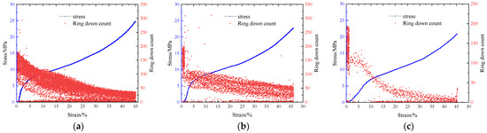 Engineering stress–strain curves and AE ring down count relationships at various compression rates: (a) 2 mm/min; (b) 10 mm/min; (c) 50 mm/min.
