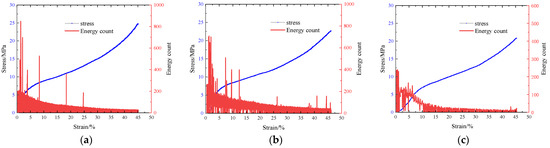 Figure 8 depicts the relationship between the engineering stress–strain curves and AE energy counts of open-cell aluminum foam during quasi-static compression tests. The results demonstrated that the energy counts in the elastic stage were generally high and the values fluctuated widely. This was attributed to the small deformation of the weak pore wall and prism in the structure, which resulted in the change in the cell shape (2% strain, see Figure 5). With the increase in strain, the energy count fluctuated less, and a number of high-energy burst-type AE signals were generated between the strain of 5–20%, indicating that the structure was fractured due to deformation of the specimen, with stress concentrations occurring in the weak areas of the prisms and pore walls (5% and 16% strain, see Figure 5). In the slip zone with a 45° angle to the compression direction of the specimen, the collapse deformation of the cell pores was obvious. Then, the specimen began to enter the densification stage. As the compression rate increased, the value of the energy count decreased, and the high energy burst-type signal also diminished, indicating that the deformation of the pore wall differed at different compression rates or there were some averaging effect, such as signal attenuation caused by experimental devices or other factors.