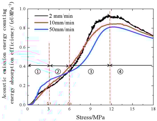 The AE energy absorption efficiency curve [18,50] obtained by Equation (2) is shown in Figure 10. The energy change curve of the AE signal had the same trend as the energy absorption efficiency curve of aluminum foam. At lower compression rates, fewer regions of plastic deformation occurred per unit of time, and the energy release process was slow but sufficient, which thus released more AE energy from acoustic emission.