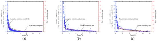 The relationships between the work hardening rate, AE ring down count rate, and engineering strain of the specimen during quasi-static compression are displayed in Figure 11.