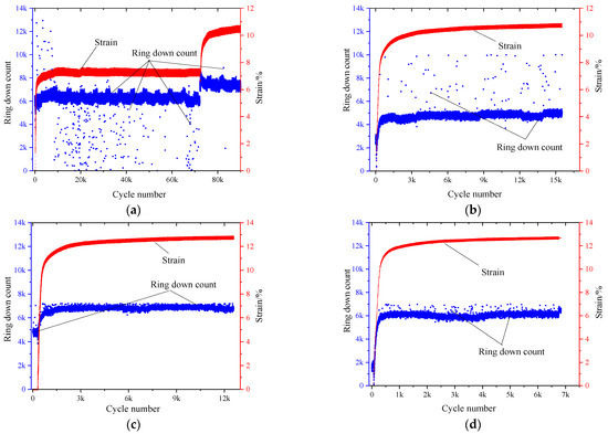 AE ring down count versus the number of cycles and strain at different k values: (a) k = 1.0; (b) k = 1.1; (c) k = 1.2; (d) k = 1.3.