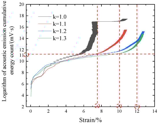 Figure 17 shows the relationship between the logarithm of AE cumulative energy count and the strain during fatigue loading. The results showed that the AE cumulative energy counts under different peak stresses followed the same growth trend in the rapid growth stage of strain rate, and gradually converged to the same value until the strain rate slowed down. Subsequently, as the strain slowly increased, the AE cumulative energy counts at different k values began to increase to a maximum value with a similar growth curvature. When fatigue failure was reached (10% strain), the smaller the k value, the greater the AE cumulative energy count.