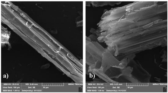 Scanning electron microscopy analysis was utilized to examine the morphology of the tested OS and IOS. The results displayed in Figure 1 reveal that the pristine OS had a continuous and flat structure with notable channels and cracks through the whole surface, characteristic of lignocellulosic biomass [1]. On the other hand, Figure 1b implies that increased surface area was achieved upon DES modification treatment. As is already known, the DES treatment leads to the degradation of the structural constituents of lignocellulosic biomass, and thus new materials with improved adsorption performances are obtained [20]. Accordingly, the relatively smooth surface of the OS becomes significantly disorganized after modification. Numerous channels and irregularities, as well as a much rougher heterogeneous structure compared to the native material, are noticeable (Figure 1b). The formation of porous structures after the modification of hazel with an ionic liquid was observed by Gollakota et al. [3]. In addition, the appearance of new cracks ensures a better diffusion of ions during the contact of metal solutions with the material surface. The obtained results are in accordance with previous studies, which confirmed that biomass modification caused similar surface disarrangement and improved adsorption performances for metal ion removal [1,20].