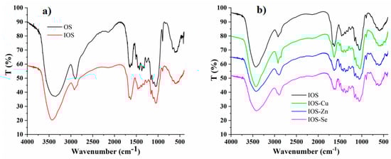 In order to determine the structural differences caused by modification, detailed characterizations of OS and IOS were performed. Surface characterization was performed by FTIR analysis using the Thermo Scientific Nicolet iS50 FTIR spectrometer. Analyzed samples were prepared by mixing 0.8 mg of the OS or IOS with 80 mg of KBr and recording in the 4000 to 400 cm−1 spectral range.
