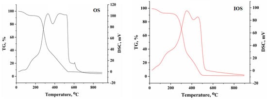 The DSC/TG diagrams implied that the OS and IOS have three distinct reaction zones. The first zone on the TG diagram originated from the weight losses (6.70 and 6.83% for OS and IOS, respectively) caused by water evaporation [12,27]. The second weight loss that starts at 200 °C indicates that degradation of the biomass structural constituents (lignin, cellulose, and hemicellulose) has begun [27,28]. Firstly, the decomposition of OS and IOS starts slowly, while intensive mass losses caused by volatilization of structural components become more pronounced at 260 °C (55.43 and 57.53%, for OS and IOS, respectively). The third phase covers the range from 360 to 530 °C for the OS sample. In the case of the IOS sample, this phase ends before 530 °C, which indicates a lower lignin content compared to the OS sample [28]. In addition, the weight loss of both samples reaches more than 90% at 600 °C, and this is in agreement with previous literature data [29]. The residual weight loss for the OS and IOS samples was 5.79% and 1.02%, respectively. According to the obtained results, it can be concluded that partial lignin degradation has occurred as a result of DES modification.