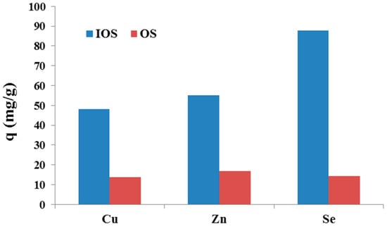 The adsorption of Cu(II), Zn(II), and Se(IV) on the IOS reaches its maximum at pH < pHpzc (Figure S1). At this pH value, the surface of the modified material is positively charged, indicating that during the removal of positively charged cations (Cu(II) and Zn(II)), electrostatic forces do not play a significant role, but they are involved in the interaction of the IOS surface with negatively charged oxyanions (Se(IV)) [1,26]. This could be an additional explanation for why the adsorption capacity for Se(IV) removal is higher in comparison to Cu(II) and Zn(II).