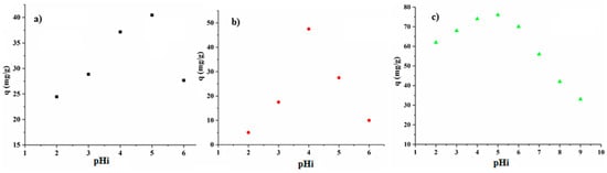 The neutral value of the surface charge is determined by the point of zero charge (pHpzc). According to pHpzc, the adsorbent surface charge is positive and could interact with negatively charged ions at a pH lower than pHpzc; on the contrary, a negative surface charge is achieved at a pH higher than pHpzc. The knowledge gained from the pHpzc may indicate the involvement of possible electrostatic interactions between the adsorbent surface and ions in solution [1,26].