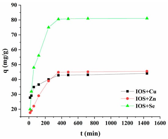 The effect of contact time was examined in order to define the equilibrium time of metal ion sorption at the IOS surface. The reduced concentration trends of the investigated ions were monitored during a period of time from 15 to 1440 min. The results are shown in Figure 5. During the initial time interval, fast sorption was observed for all tested ions; thus, almost 50% of Cu(II), Zn(II), and Se(IV) ions were removed in the first 15 min. This occurrence is most likely the result of the interface of ions with the available active sites on the adsorbent surface [34]. After this period, adsorption capacity gently grows until the equilibrium of the system is reached. The equilibrium capacities of Cu(II), Zn(II), and Se(IV) ions were 42.16, 34.5, and 81 mg/g, respectively. Their equilibriums were reached for 360 min (Figure 6).