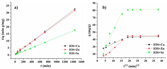 Kinetic adsorption curves for pollutants adsorption onto IOS: (a) pseudo-second-order; (b) Weber–Morris intra-particle diffusion. (pH 5 for Cu(II) and Se(IV), pH 4 for Zn(II), T = 25 °C, C0 = 1 mM adsorbent dosage = 1 g/L for Cu(II), Zn(II), and 0.5 g/L for Se(IV)).