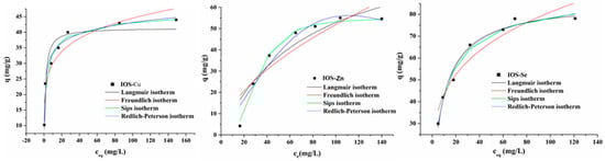In order to define the equilibrium of Cu(II), Zn(II), and Se(IV) adsorption on IOS, the obtained experimental data were fitted by Langmuir, Freundlich, Sips, and Redlich–Peterson isotherm models. Generally, isotherms can provide insight into the nature of interaction between the pollutant and adsorbent materials surfaces, and thus allow the assumption of a possible binding mechanism [26].