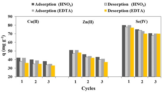 The adsorption/desorption ability was tested and calculated for each of the three cycles and displayed in Figure 9. As Figure 9 shows, tested desorption agents maintain high ion removal efficiency. The adsorption capacity for Cu(II), Zn(II), and Se(IV) slightly decreases with cycles, but capacity did not drop more than 10%. Besides, HNO3 proved to be a slightly better desorption agent than the EDTA solution. Since desorption efficiency after tree cycles was more than 90%, it can be concluded that IOS can be effectively regenerated.