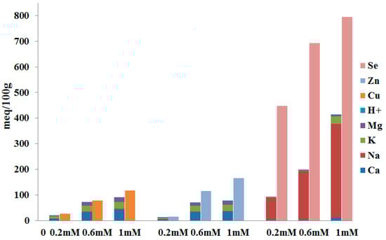 To examine the possible ion-exchange mechanism during the adsorption of Cu(II), Zn(II), and Se(IV) ions, filtrates upon adsorption are subjected to determination of the released cations (Ca2+, Mg2+, K+, Na+, and H+). The influence of van der Waals forces was eliminated by using a control sample (filtrate) obtained by mixing IOS in ultrapure water at pH 5.0. The materials were shaken for 24 h at 220 rpm at room temperature. The content of Ca2+, Mg2+, K+, and Na+ in the resulting filtrates was monitored using an atomic absorption spectrophotometer (AAS) (Analytic Jena Spekol 900T, Jena, Germany), while the content of H+ ions was determined from the difference in pH values between the control and filtrate after adsorption.