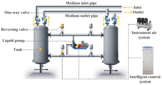 The double-chamber gas–liquid transferring device (Figure 1) is mainly composed of three major systems, i.e., a fluid system (liquid pump, circulating tanks and pipeline, etc.), a control system (reversing valves, one-way valves and intelligent control system, etc.), and an instrument air system (air compressor, pipeline, etc.). The geometric parameters of the tanks and pipes are shown in Table 1.