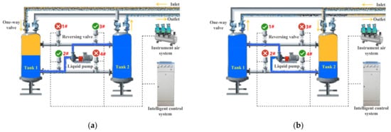 During the operation of the device, when liquid is transferred from tank 1 to tank 2 using the liquid pump, tank 1 and tank 2 are the suction chamber and compression-discharge chamber for the inflow medium, respectively. As shown in Figure 2a, the reversing valves 2# and 3# are open, while valves 1# and 4# are closed. The incoming gas–liquid mixture flows through the inlet pipeline into tank 1, guided by the one-way valve. The gas–liquid mixture is separated in tank 1 due to gravity, and the liquid in the bottom is pumped and pressurized by the liquid pump to tank 2. The liquid level in tank 1 decreases and the liquid level in tank 2 increases. When the liquid level in tank 2 is high enough to make the pressure in the tank reach the set superior limit, the intelligent control system will open the outlet valve of the device, and the gas–liquid medium in tank 2 will be discharged from the outlet of the device. When the liquid level in tank 1 drops to the set lower limit (25% liquid level), the reversing valves are automatically switched by the intelligent control system. Reversing valves 1# and 4# are open, 2# and 3# are closed, and the device outlet is temporarily closed. At this moment, tank 1 and tank 2 exchange functions. The incoming medium flows into tank 2, guided by the one-way valve, and the gas–liquid separation is carried out in tank 2. The liquid is pressurized by the liquid pump from tank 2 to tank 1, and the medium in tank 1 flows out from the outlet pipe after the pressure reaches the set value (Figure 2b). In this way, the continuous pumping and transportation of the gas–liquid mixture is ultimately achieved.