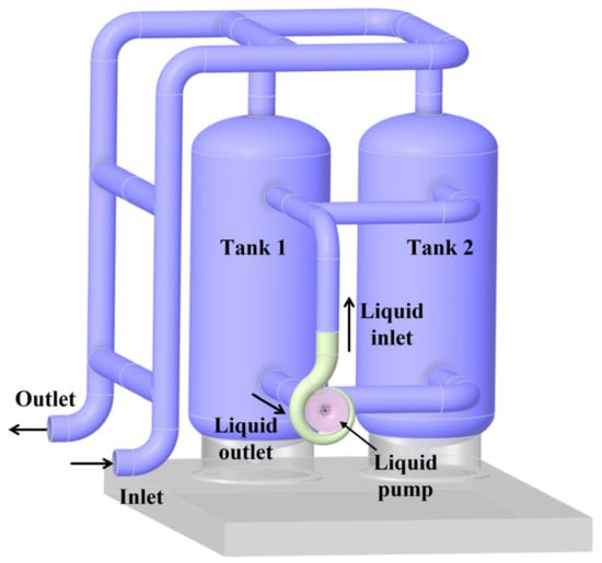 In addition, Guan et al. [17,18] recently developed a novel double-chamber gas–liquid transferring device. In this device, two tanks alternately become the suction chamber and the compression-discharge chamber for the incoming gas–liquid flows. A liquid pump is used to transfer liquids from one tank to the other, thereby realizing the continuous transportation of the gas–liquid medium. The device was already applied in oilfields and is expected to become an effective gas–liquid two-phase transferring tool with wide application prospects, due to its simple structure and adaptability to various inflow conditions. However, the working principles and operating cycle laws in this kind of double-chamber gas–liquid transferring device are still unclear. In this paper, therefore, the gas–liquid two-phase flows field in a double-chamber gas–liquid transferring device was simulated numerically using FLUENT software, to understand the working principle of the device and the internal mechanism of gas–liquid two-phase flows, and to provide a theoretical basis for improving the design of the double-chamber gas–liquid transferring device.
