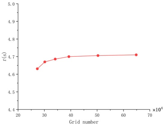 The independence verification for the computational grid was performed as shown in Figure 4. The time interval that the outlet pressure of the device reached the set value from the initial state was taken as the indicator for investigation. The polyhedral grids with different grid densities were selected for calculation because the number of polyhedral meshes could be much less than that of tetrahedral meshes with the same accuracy. Since the numerical simulations were made for the whole model of the device and a short time step was required for the two-phase flow in the study, it took more than three weeks to calculate a complete working cycle using a Dell Workstation (Precision Tower 7920). Based on the results in Figure 4, the polyhedron grid with grid number 392860 and node number 2102518 was finally selected as the computational do-main grid for the subsequent calculation, considering both calculation cost and accuracy.