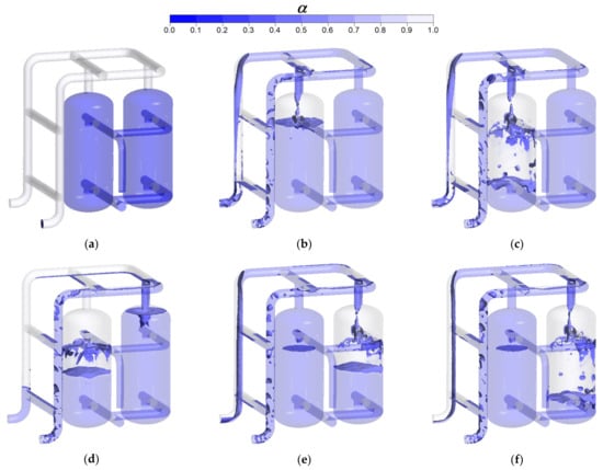 Figure 5 shows the calculated distribution of gas volume fraction at different liquid levels. The initial state of the calculation was that the two tanks were filled with liquid and the pipeline was filled with gas (Figure 5a). After the device started to operate, the gas–liquid medium entered the device from the inlet in the design condition. The gas–liquid separation was formed in tank 1 due to gravity (Figure 5b), and the inflow of the liquid pump was not entrained with gas phase content. The liquid level in tank 1 was further lowered as the liquid in tank 1 was continuously transported to tank 2 (Figure 5c). When the liquid level in tank 1 dropped to the set lower limit, the reversing valves automatically switched. After switching, the gas–liquid medium entered tank 2 from the inlet of the device and formed phase separation. As the liquid in tank 2 was pressurized by the pump into tank 1, the gas–liquid medium in tank 1 was compressed and discharged out of the outlet of the device (Figure 5d–f).