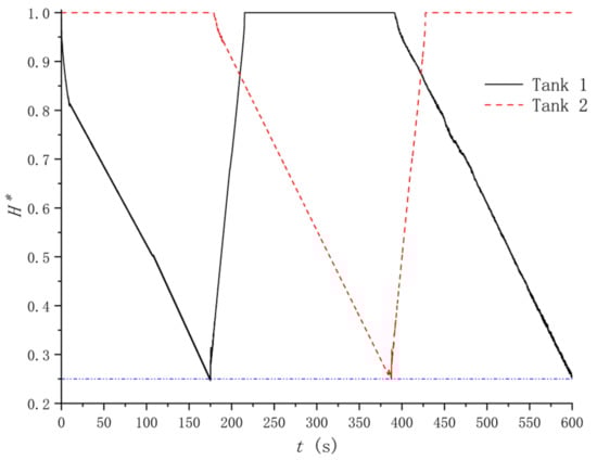 Some features are also found in Figure 6 as follows. At the beginning, the liquid level in tank 1 continued to decline as the liquid was pumped from tank 1 to tank 2, and the liquid level in tank 2 remained full. However, the liquid in tank 1 was supplemented to some degree from the inflow, so the liquid level dropped slowly with a decreasing speed to a value of about . At this time, the reversing valves automatically switched. The liquid in tank 2 was delivered to tank 1 by the pump, which made tank 1 full of liquid in a relatively short time. When the liquid level in tank 2 gradually decreased to a value of about , the reversing valve switched again into the next operating cycle.