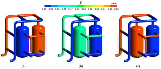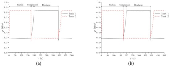 Figure 8 shows the calculated pressure distribution in the device during an operating cycle. In the suction process (Figure 8a), the pressure in tank 1 was basically consistent with the inlet pressure of the device, while the pressure in tank 2 was consistent with the outlet pressure of the device. In the compression process (Figure 8b), however, the pressure in tank 1 gradually increased but not yet reached the set value. The pressure in tank 2 was consistent with the inlet pressure of the device. In the discharge process (Figure 8c), the pressure in tank 1 reached the set value and was consistent with the outlet pressure of the device, and the pressure in tank 2 was consistent with the inlet pressure of the device.