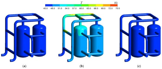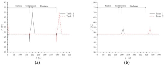 Figure 9 shows the calculated average temperature of the two-phase medium in the tanks with time. It can be seen from Figure 9 that the temperatures in both the gas and the liquid were basically the same in the suction and discharge processes, and maintained at about 48 °C. In the compression process, however, the gas temperature rose considerably due to the compression by the liquid, and the maximum temperature difference with the inlet was about 23 °C. Meanwhile, the liquid temperature also rose due to heat exchange between the two phases, but the maximum temperature difference with the inlet was about 6 °C.