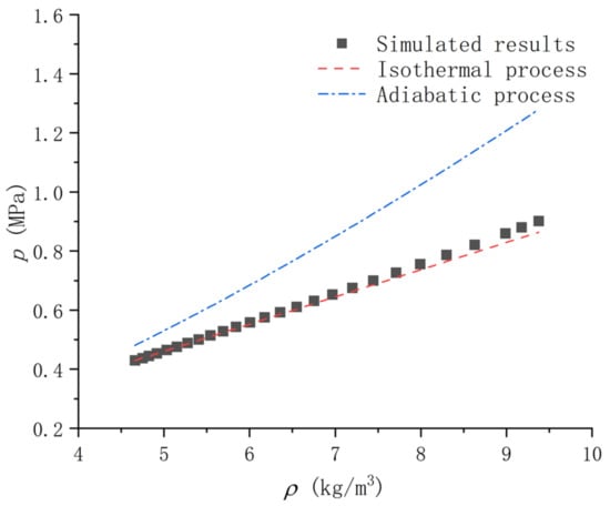 In order to understand the general law of the gas compression process of the device, Figure 12 shows the relationship between the calculated average pressure p and the average density ρ of the gas in tank 1 during the compression process, together with the theoretical curves of the isothermal process and adiabatic process of an ideal gas [22]. It can be seen from Figure 12 that the curve during the gas compression process in the tank quite meets that of the isothermal process, due to the absorption and the removal of the heat by the operating liquid. In engineering design, therefore, the gas compression process in the device can be approximately regarded as an isothermal process similar to the treatment of gas in liquid ring compressors [23,24].