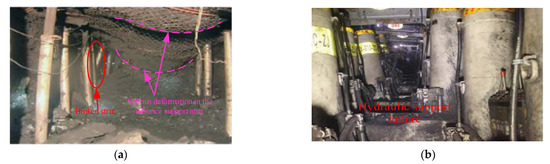 Figure 1. Site strong mineral pressure appears. (a) Over-supported monolithic column fracture. (b) The hydraulic support at the working face is crushed.