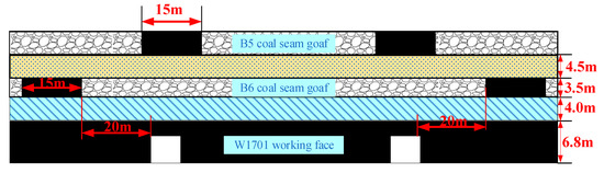 The inducing factors of abnormal coal seam pressure at a very close distance are complex, but it is most affected by the residual coal column and overburden fault transport in the goaf area [28,29,30,31]. The W1701 working face belongs to the extremely close multi-seam mining area, and the working face is staggered under the B6 coal seam mining area (Figure 2), and there is a large horizontal staggering distance (20 m) from the overlying coal column, so it is less likely to be affected by the concentrated stress of the coal column left in the B6 coal seam mining area. The influence of concentrated stress is less likely, and the coal pillar left in the B5 coal seam mining area was destabilized and broken when the B6 coal seam was retrieved, which also had little influence on the W1701 working face; therefore, the W1701 working face is most likely to be affected by the strong mine pressure of the overlying rock structure movement during the retrieval process.