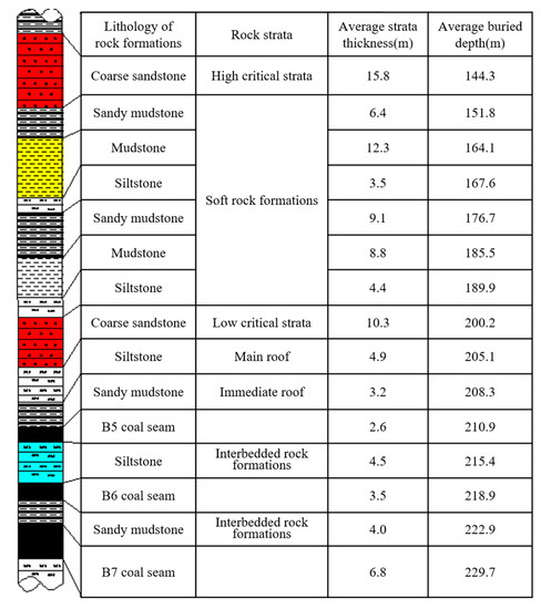 According to the comprehensive bar diagram of the coal seam geological drilling in Figure 3 and combined with the key layer theory [32,33], it can be seen that the overburden rock above the B7 coal seam is endowed with two key layers, among which the low key layer is coarse sandstone with a thickness of 10.3 m, the high key layer is coarse sandstone with a thickness of 15.8 m, and the rock layers between the key layers are mainly soft sandy mudstone, mudstone, and thin siltstone, with a total thickness of 44.5 m (Figure 3) On the whole, the overlying rocks of W1701 workings generally show the structure of “high key layer (hard rock)–giant thick soft rock group–low key layer (hard rock)”, and the overlying rocks of “high key layer (hard rock)–giant thick soft rock group–low key layer (hard rock)” during the mining process of the very close coal seam. It is necessary to study the characteristics of the overlying “high key layer (hard rock)–huge soft rock group–low key layer (hard rock)” structure to grasp the incoming pressure law of the roof of the W1701 working face.