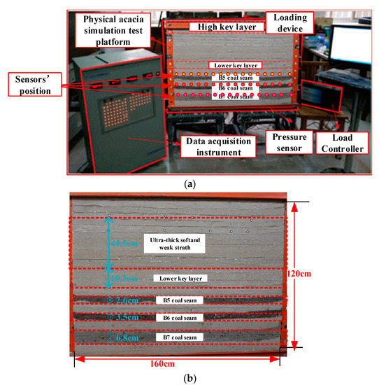 Figure 4. Similar material experimental model. (a) Experimental monitoring equipment. (b) Main parameter.