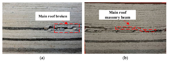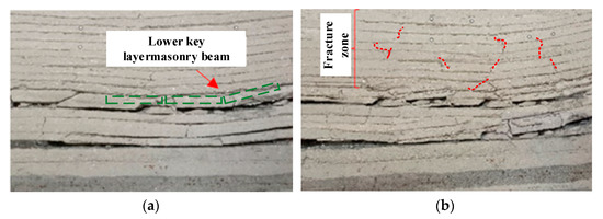 Figure 6. Overburden fracture characteristics of B6 coal seam working face mining. (a) Low key layer “masonry beam” structure. (b) Workface retrieval completed.