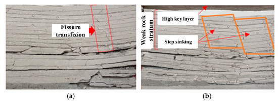 Figure 7 shows the characteristics of strata caving and fracturing during the mining of coal seam B7. Due to the large thickness of coal seam B7, the mining disturbance is more intense, providing ample space for the overlying roof to collapse and sink. The 4.0 m-thick sandy mudstone between coal seams B6 and B7 squeezed and burst out during mining, causing the previously stable lower key strata to continue to sink, creating small periodic pressure. When the working face advanced 40 m, the 44.5 m-thick weak rock group between the high and low key strata developed upward fractures continuously until a longitudinal through crack was formed in the high key strata (Figure 7a), accompanied by a relatively large separation space between the high key strata and the weak rock group. The weak rock group was sheared and fractured along the through crack, causing periodic stepwise sinking (Figure 7b), resulting in a large cyclic pressure with a step distance of about 40 m.