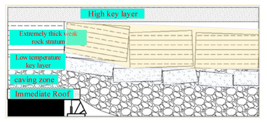 Through similar simulation experiments, it is known that the cause of strong mine pressure at the W1701 working face is closely related to the overburden structure and movement of “high key layer (hard rock)–huge thick soft rock group–low key layer (hard rock)” above it. After the destabilization of the structure, the “masonry beam” of the low-key layer, the huge thick weak rock group above it forms penetrating fissures, and shear breakage occurs as a whole, resulting in periodic step-down movement (Figure 8b), which causes the peak pressure of the roof support to jump and increase suddenly. This is the main reason for the strong mine pressure at the working face [34,35].