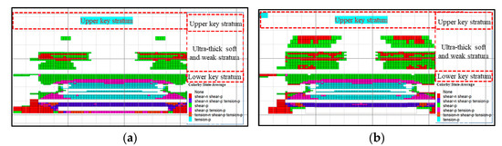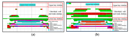 Figure 11. Cloud map of overburden plasticity zone for Option 2 stratified mining. (a) Upper stratification (mining thickness 2.8 m). (b) Lower stratification (mining thickness 4.0 m).