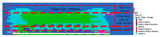 The development pattern of the plastic zone in the surrounding rock with different thicknesses of layered mining is shown in Figure 10 and Figure 11. From the analysis of Figure 10 and Figure 11, it can be seen that after adopting layered mining, the thick and weak rock formations between the high and low key layers have undergone staged damage, and the fracture energy of the “thick and weak rock formations” has been released in stages. When the thickness of the upper layer mining is 3.4 m (Scheme 1), after the upper layer coal seam mining is completed, the low-key layer undergoes plastic damage, and there are also some plastic zones developed in the thick and weak rock formations. After the current layer of coal seam mining is completed, the plastic zone further develops upwards, with a development height of up to 34 m. When the thickness of the upper layer mining is 2.8 m (Scheme 2), although the low key layer is also damaged after the coal seam mining is completed, the development height and range of the plastic zone are significantly smaller than in Scheme 1, with a development height of 30.5 m. By comparing the development cloud map of the full-thickness mining plastic zone in a single mining operation (Figure 12), it can be seen that when using a full-thickness operation to mine the B7 coal seam, not only the low-key layer and weak rock formations are damaged, but also the high key layer undergoes plastic damage. Moreover, the development range of the plastic zone is extremely wide, seriously threatening the production safety of the mining site. Therefore, in order to avoid strong rock pressure during the mining process of the B7 coal seam working face in the lower layer of the close-range coal seam group, layered mining should be selected, and the thickness of the upper and lower layered mining should be 2.8 m and 4 m, respectively.