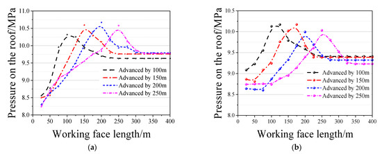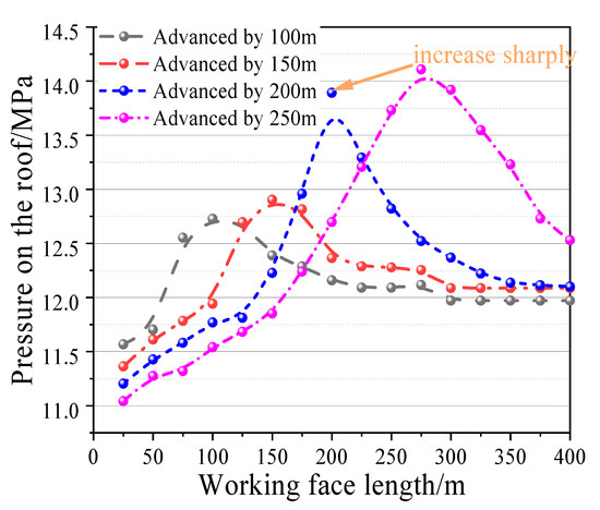 According to Figure 13, when the entire thickness is mined in one pass, the peak value of the roof support pressure continuously moves forward with the advancement of the working face and gradually increases. Before the working face advances 150 m, there is little variation in the peak value of the support pressure. However, when the working face advances from 150 m to 200 m, the peak value of the support pressure jumps from 12.8 MPa to 13.9 MPa. This is because the thickness of the working face is large. After the working face is mined, it provides a large space for the roof to sink, and the weak rock strata undergo large displacement, which brings a great impact on the working face.