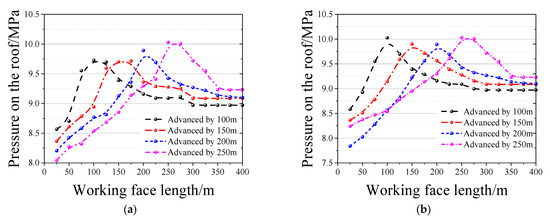 Figure 15. Scheme 2 stratified mining roof support pressure variation curve. (a) Upper stratification (mining thickness 2.8 m). (b) Lower stratification (mining thickness 4.0 m).