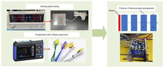 In this experiment, 15 K-type thermocouples and 5 voltage acquisition signals were set on the front, side, back and upper surfaces of each battery. During the experiment, the thermocouple in the middle of the front wall of battery 1 would affect the heat transfer process of the heating plate, so the thermocouple in the left center of battery 1 was removed. The voltage signals were collected from the four cell voltages and the total voltage of the module.