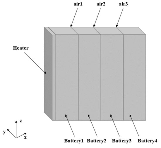 Figure 3 shows the geometric model built according to the actual size of the battery module. The four batteries are labeled as battery 1–4, the cell battery is simplified as a single cell, battery 1 is heated by a heating plate, and batteries 2–4 are affected by the thermal propagation of battery 1. Since no insulation material was added between adjacent cells in the experiment, an air layer was used in the model, and its thickness was set to 2 mm. The model can describe the real module in detail. Table 2 summarizes the physical parameters of each component.